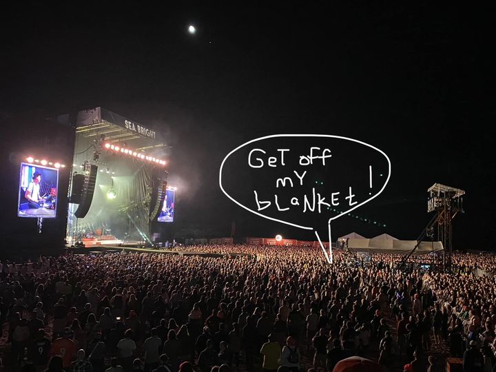 In the excitement of the start of the set, I was pushed backwards in the crowd and ended up standing on the corner of a blanket, unknowingly. I could barely even see where my feet were in the crowd. During Hand in My Pocket everyone was going wild and I felt a tap on my shoulder. I turned and saw a lady screaming, while standing in the middle of her blanket, people jammed all around it. “Could you please stop standing on my blanket!” I stepped three inches forward to fix her perceived issue. IMHO, once the set starts, you need to fold back your blanket or move further back to use it. It’s as much a safety issue as a common courtesy. You live, you learn, Karen.