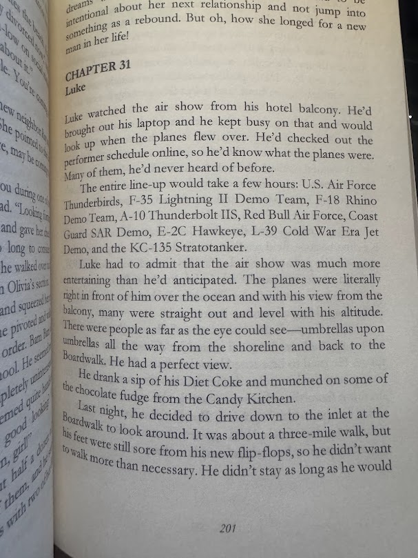 On page 201, Luke, one of the characters in the novel, watches the air show from his oceanfront hotel balcony, taking in the noise, the nostalgia, and the tension brewing just beneath the surface. If you’ve ever been in Ocean City during the air show, you’ll know exactly what he’s feeling!